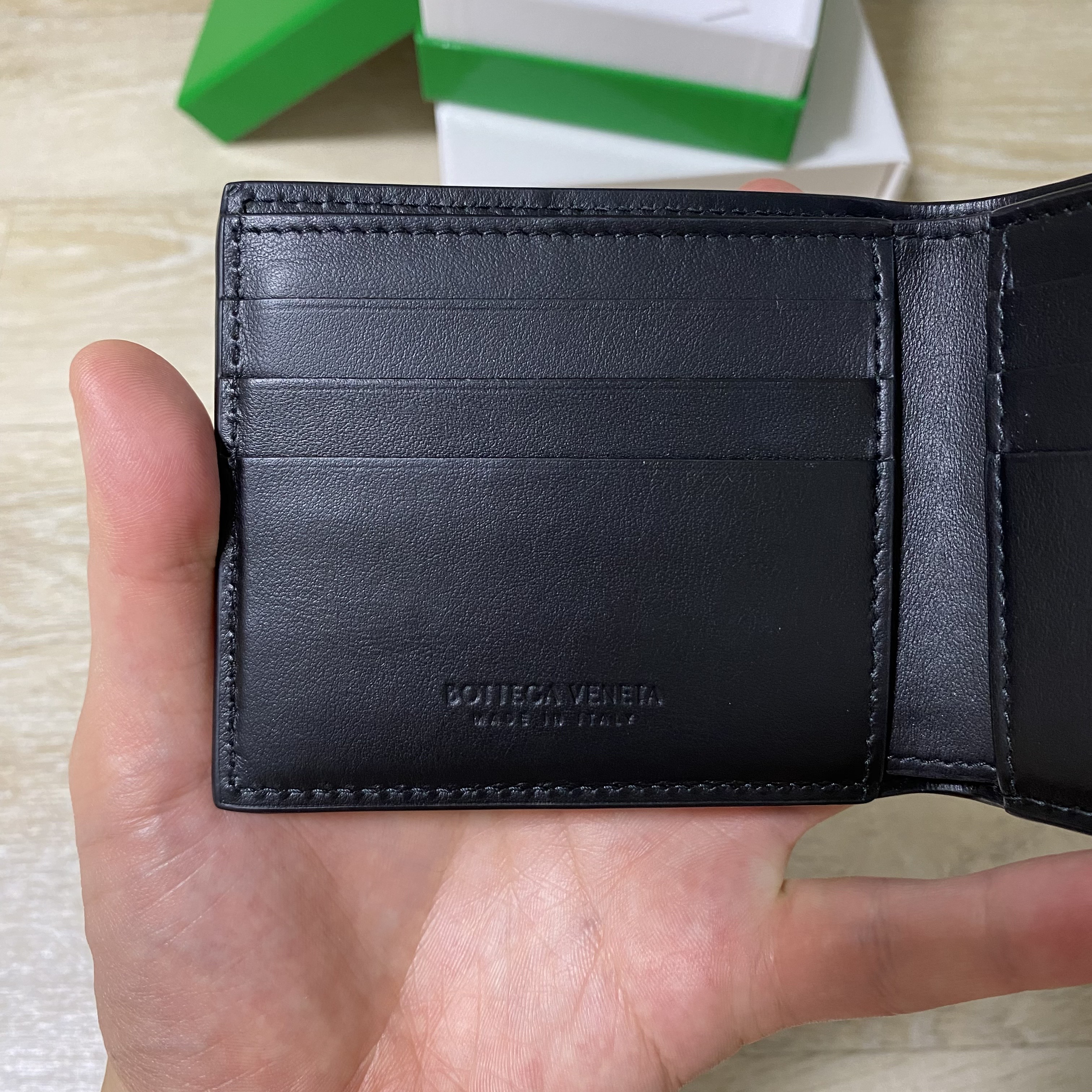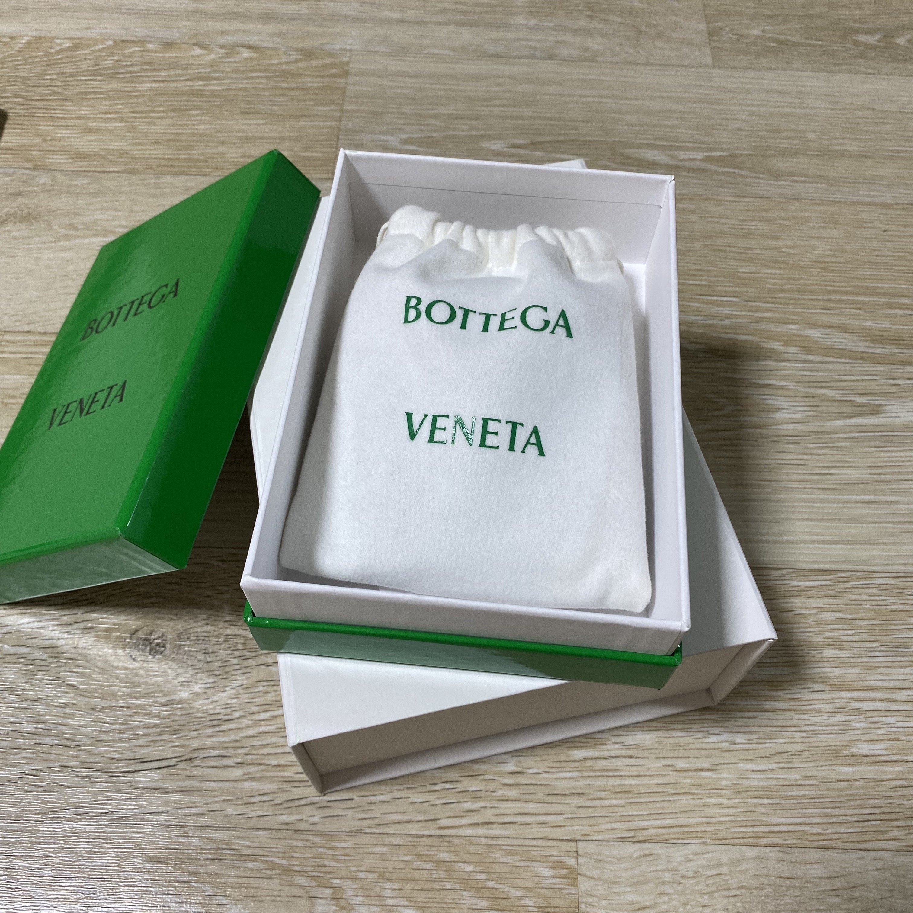 보테가 베네타 브랜드 시그니처 색상인 그린컬러의 제품 박스가 들어있다.
