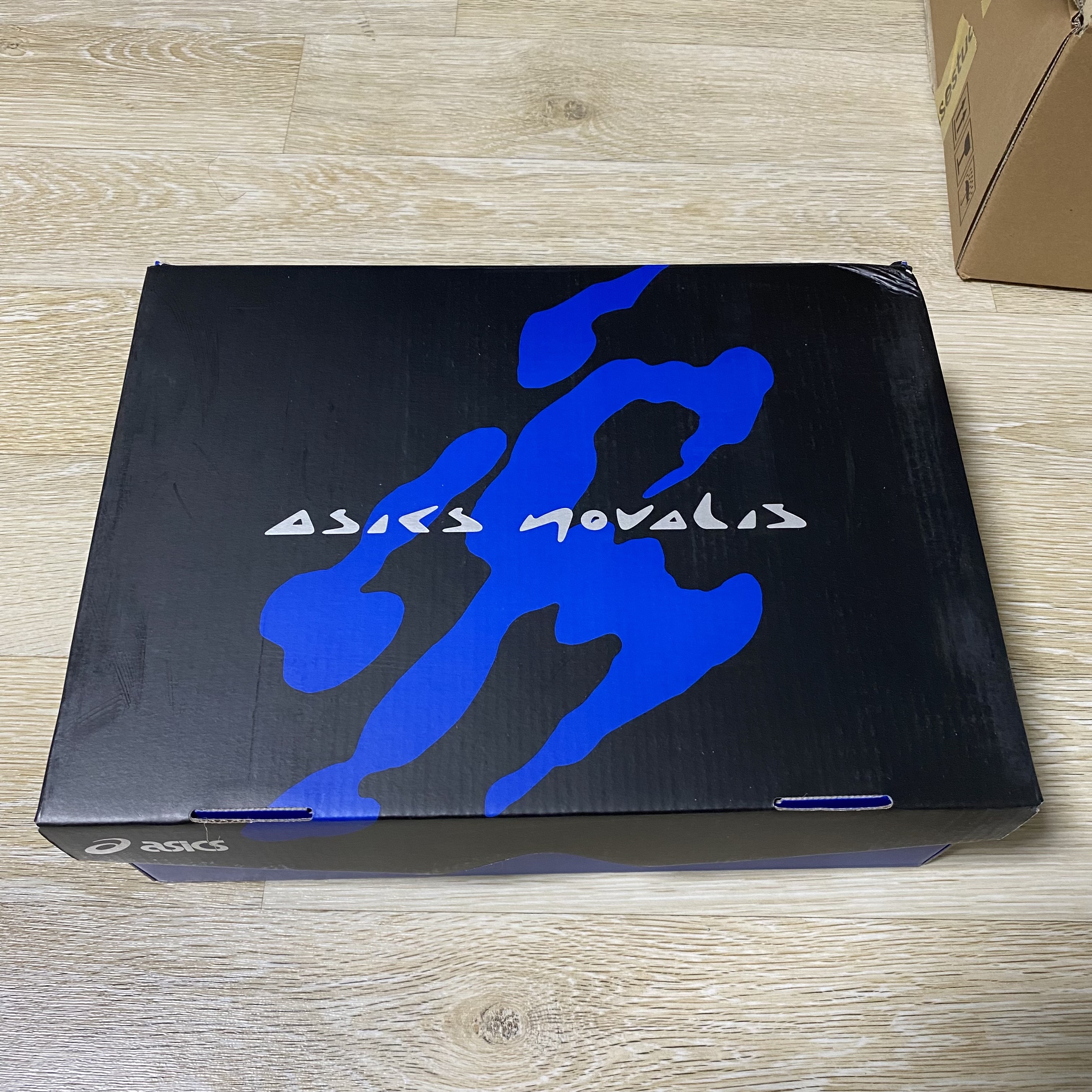 박스에는 흘겨 날린 아식스 노발리스 텍스트와 키코의 브랜드를 상징하는 심볼이 눈에 보입니다.
