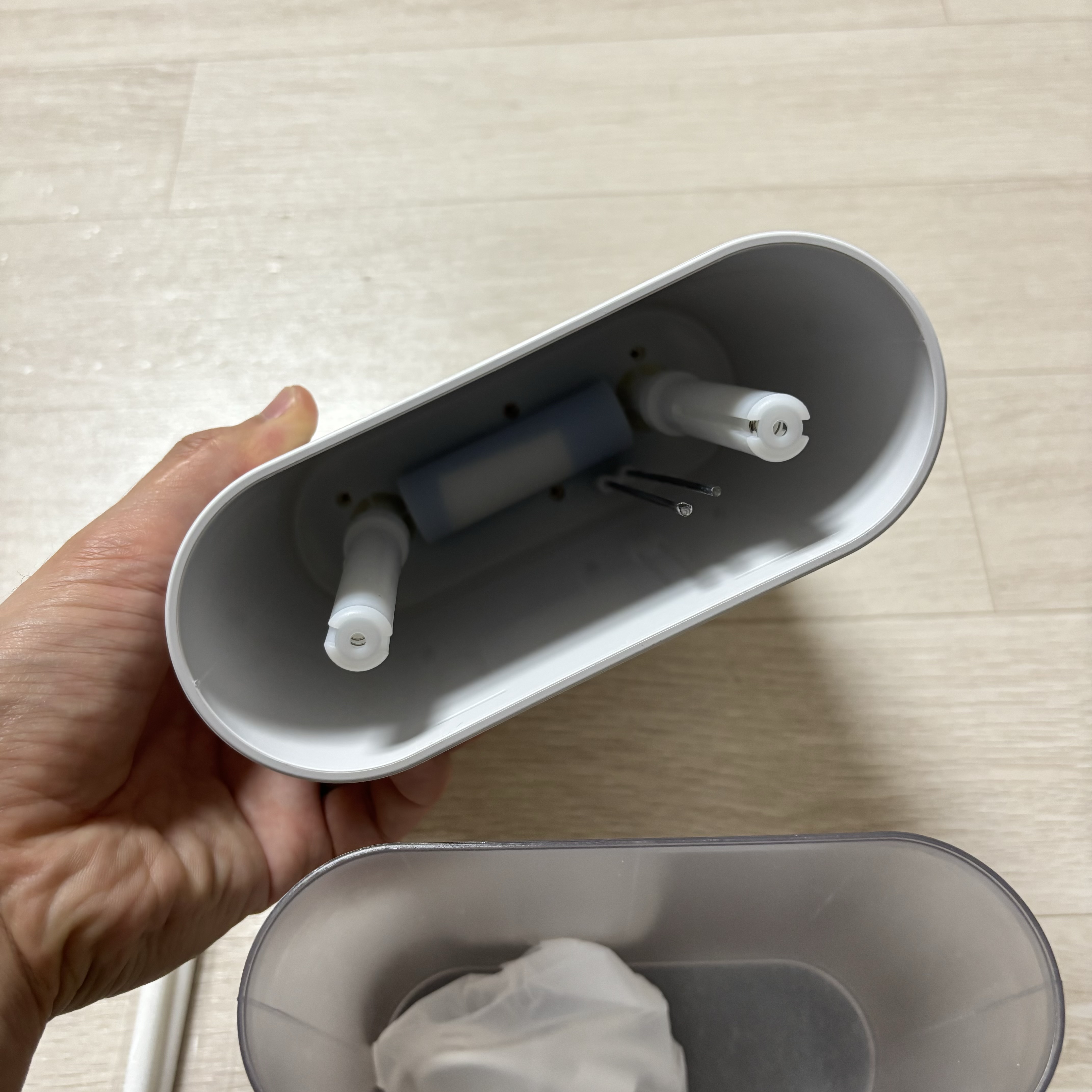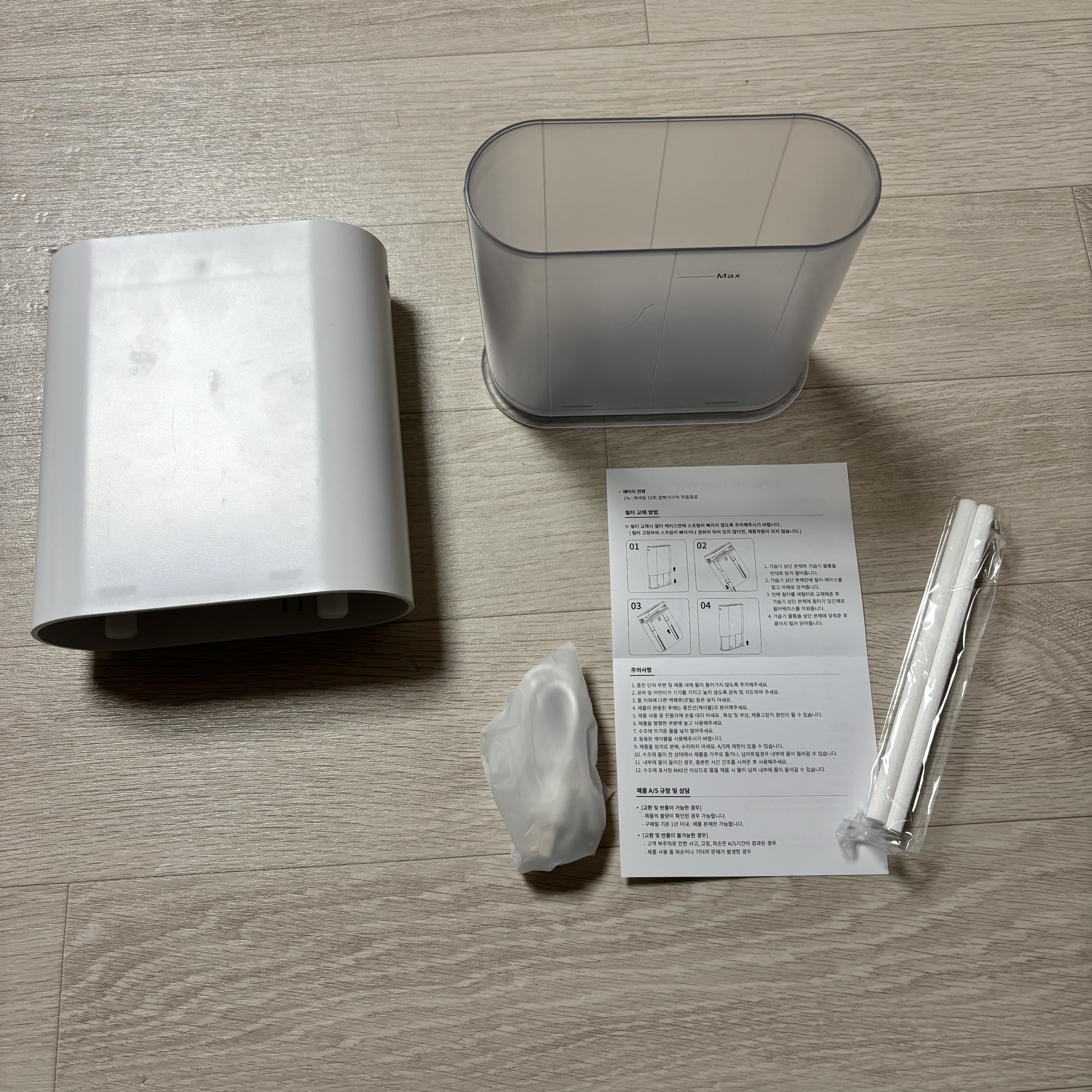 구매한 제품에는 가습기 필터 2개가 장착되어 있고 수조 안쪽에는 제품 설명서와 충전케이블이 있습니다.