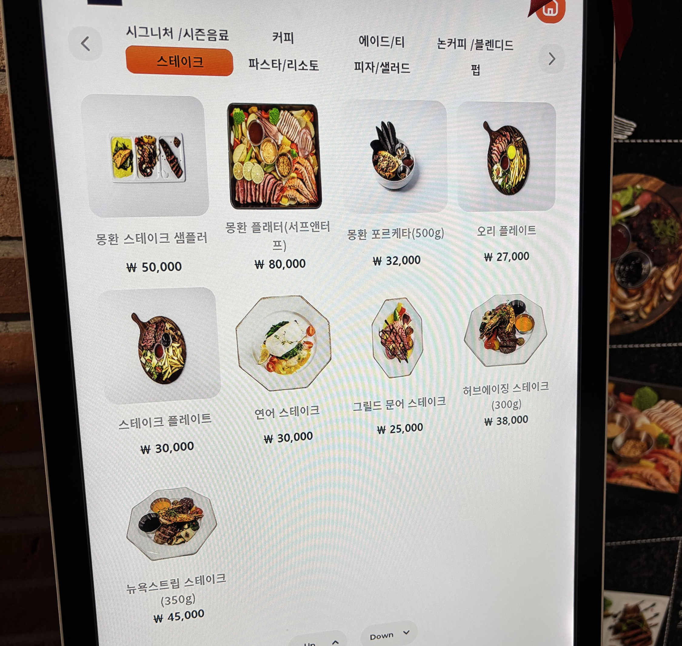 시그니처/시즌메뉴, 커피, 에이드/티, 스테이크, 파스타/리조토, 피자/샐러드, 주류 등등