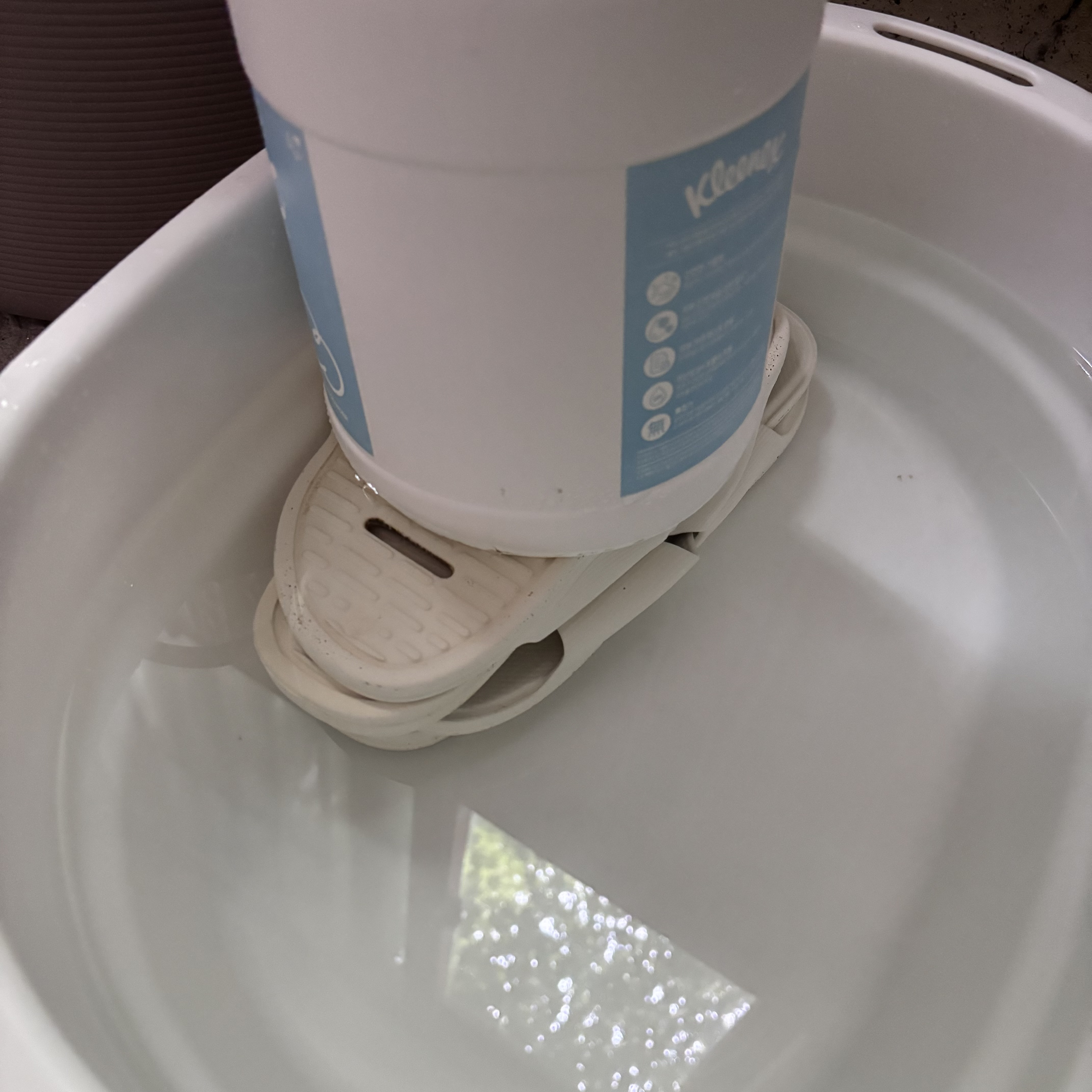 세척하는 방법은 동일하게 적당량의 물과 락스 2컵정도의 양을 섞어 욕실화를 담가 놓았습니다.