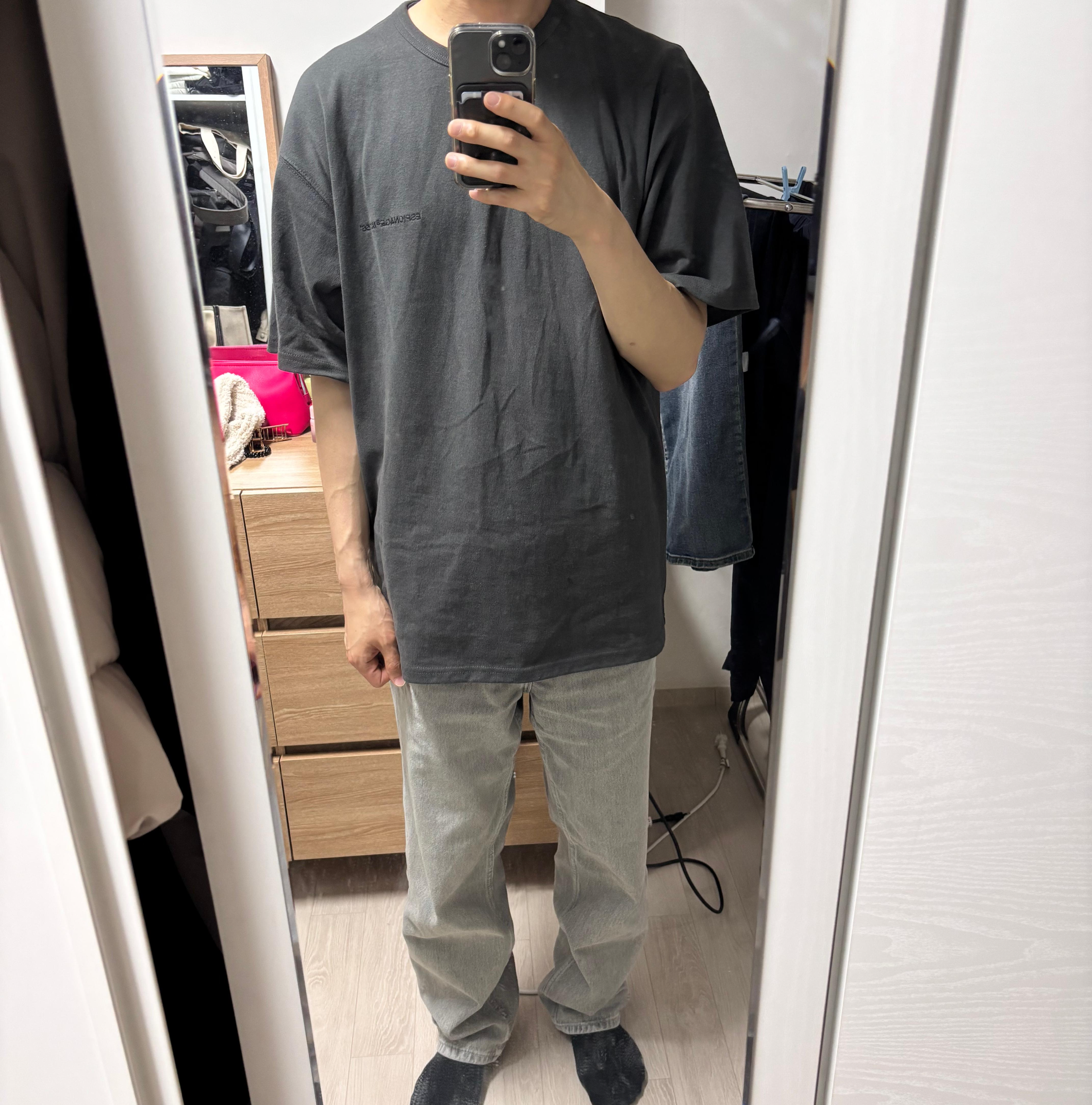 음... 예전에 구매했던 반팔티는 L사이즈가 세미오버핏으로 잘 맞았던 기억에 L를 주문했는데.