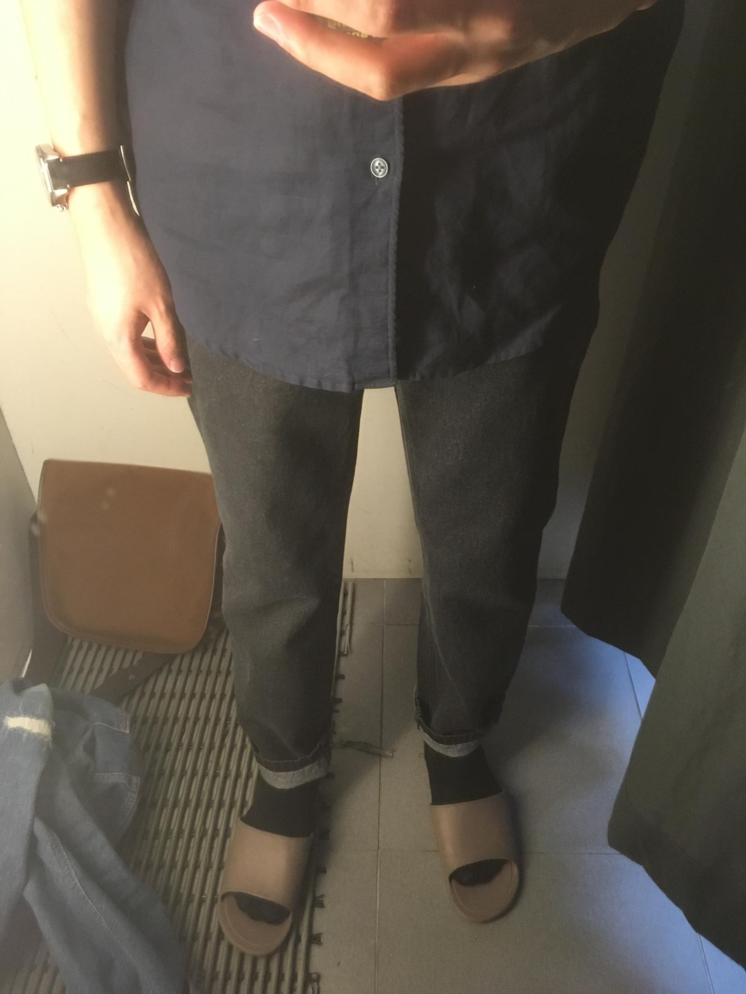 위의 두사진은 구매후 두번째 착용한 사진입니다. 소재에 있어서 cotton100%로 처음입었을떄의 무릅 부분이 두번쨰 입엇을때 어느정도 티가나는건 조금 아쉬웠습니다. 처음 매장에서 착용했을떄 깔끔하게 일자로 딱 떨어졌을때의 그 핏이 정말 S급 핏이었는데 지금의 핏도 만족스럽지만 좀 안타까운 부분입니다. 하지만 어느 바지든 피하갈 수 없는 부분이라 생각이 됩니다.