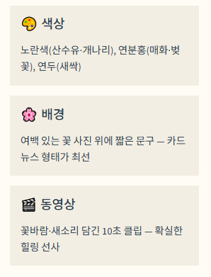 - 색상 선택: 노란색(산수유, 개나리), 연분홍색(매화, 벚꽃), 연두색(새싹)을 테마로 한 이미지를 사용하세요.