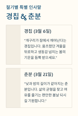 - 경칩(3/6): "개구리가 잠에서 깨어난다는 경칩입니다. 움츠렸던 겨울을 뒤로하고 생동감 넘치는 봄의 기운을 듬뿍 받으시는 하루 되세요."
