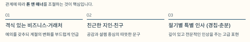 - 상대방과의 관계에 맞는 톤 앤 매너를 선택하세요.