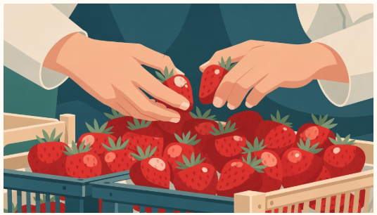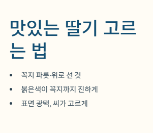 - 선택법: 꼭지가 파릇파릇하게 위로 향해 있고, 붉은 빛깔이 꼭지 부분까지 선명하게 퍼진 것이 잘 익은 딸기입니다. 표면에 광택이 나고 씨가 일정하게 박힌 것을 고르세요.