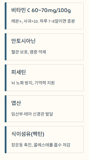 | 면역력 강화 | 풍부한 비타민 C가 백혈구 활동 지원 | 감기 예방 및 환절기 질환 방어 |