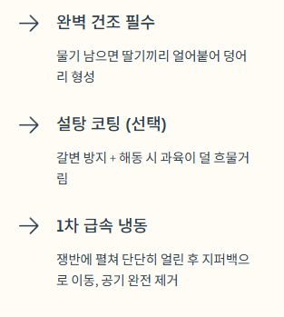 - 장기 보관 시에는 물기를 완전히 제거한 후 설탕 코팅을 곁들여 급속 냉동하세요.