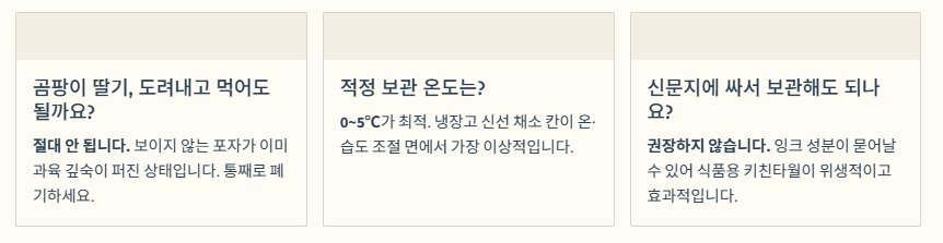 | 2단계: 수분 제거 | 세척하지 않은 상태로 겉면 확인 | 물기가 닿는 순간부터 무름이 시작됨 |