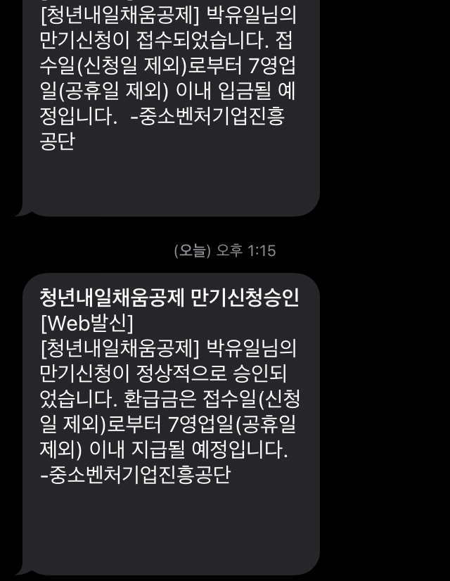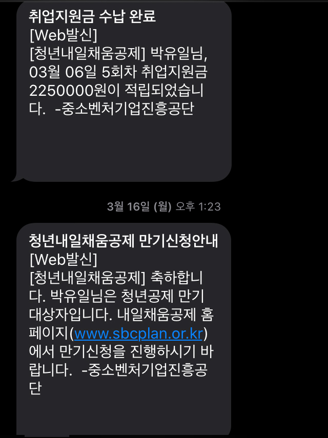 그렇게 담당기관에서 지원금 신청을 진행해주면 마지막 5회차 지원금이 적립됐다는 문자가 오고 그뒤로 약 일주일 후 내일채움공제에서 만기신청진행하라는 문자가 온다.